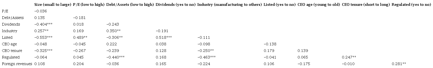 The correlations for the demographic variables are shown in Table 3. Small firms have a lower incidence of paying dividends, a lower propensity to be listed, and CEOs with lower tenure. Public firms have a higher price/earnings ratio and lower leverage. Manufacturing firms are less regulated and have higher leverage. Regulated firms have higher foreign revenues and lower leverage.