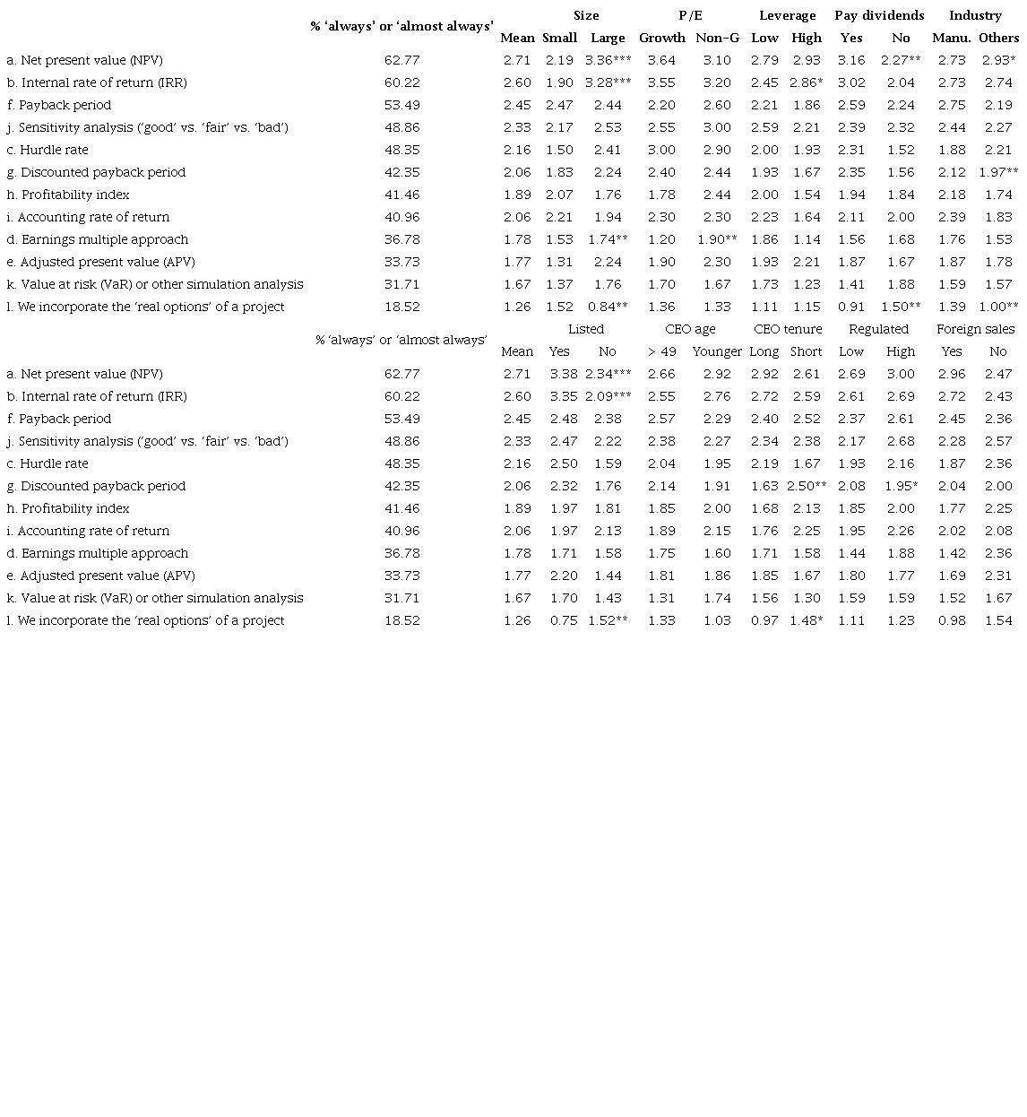 In this section, we present the results of our univariate analyses on the survey responses conditional on each separate firm characteristic. The results are grouped according to capital budgeting methods, cost of capital, and capital structure.