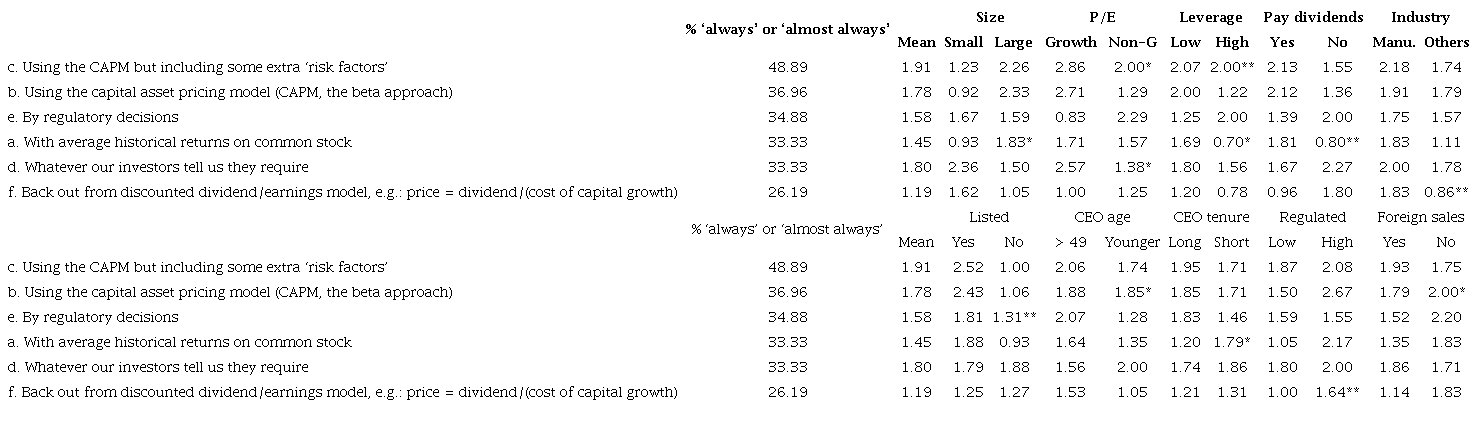There is not much difference in the cross-sectional analysis. We found that growth firms are significantly more likely to use the CAPM and some extra ‘risk factors’ than value firms. Low leverage companies have a higher propensity to estimate the cost of equity capital using the CAPM and some extra ‘risk factors’ than high leverage firms.