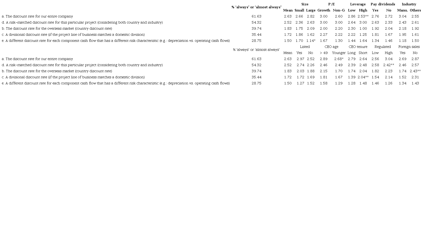 Table 6 presents the results for how often companies use some discount rates when evaluating a new project in an overseas market. Most selected the ‘discount rate for their entire company’ as their most frequent discount rate to evaluate the project. Sixty-two percent of respondents claim to use ‘always’ or ‘almost always’ this alternative. Low leverage firms are significantly more likely to use the discount rate for the entire company than firms with higher debt ratios.