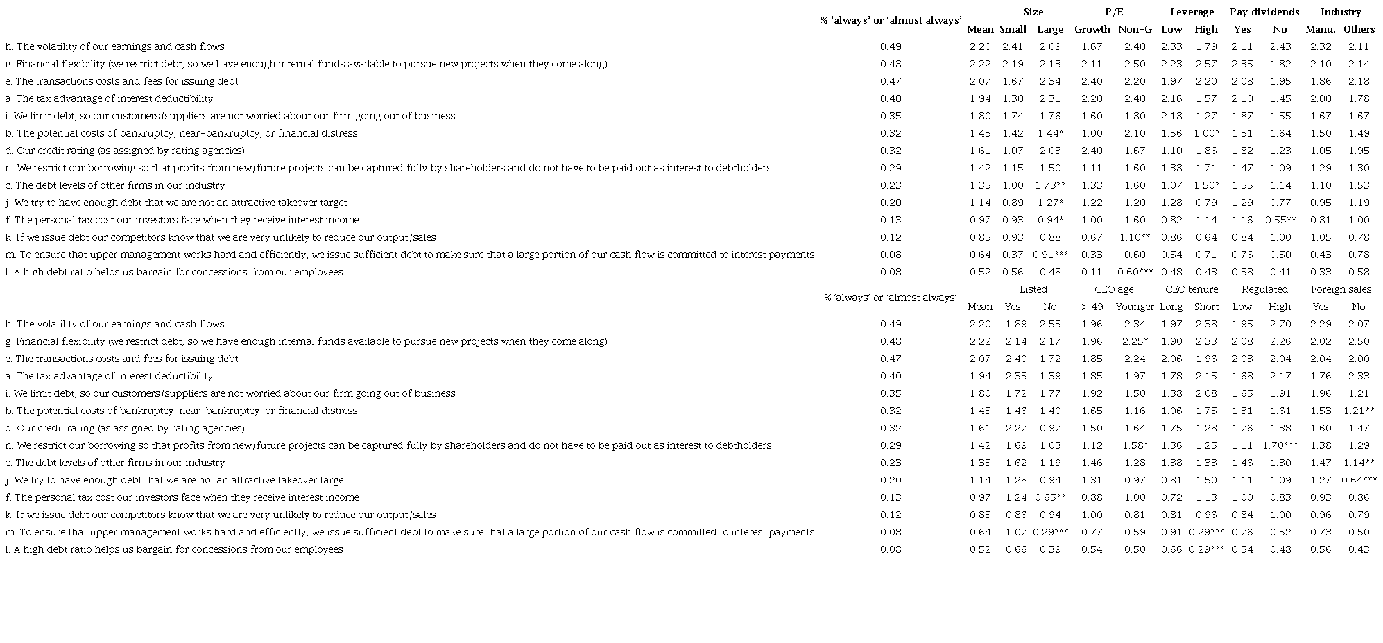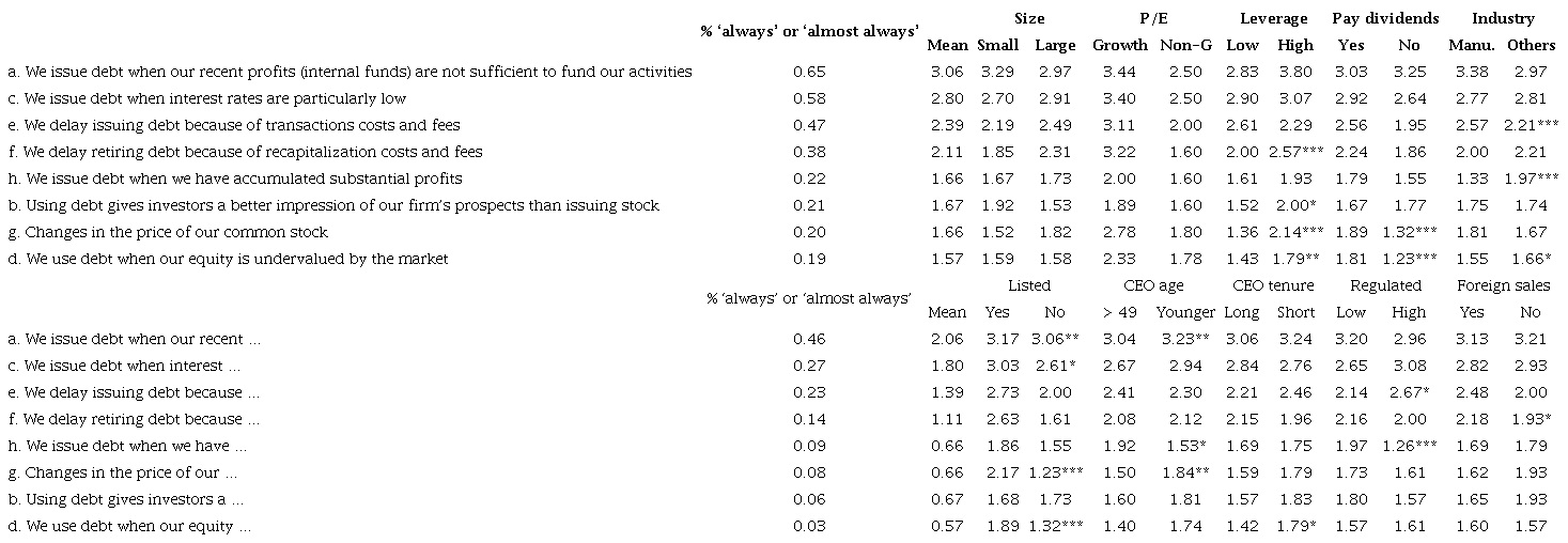 We asked managers about the factors that affect the firm’s debt policy. The results are shown in Table 9. Insufficient internal funds are the most important factor in the decision to issue debt, 65% of respondents selected this alternative as ‘important’ or ‘very important’. This is consistent with the pecking-order theory. This factor is significantly more important for listed firms than unlisted firms and also for firms with younger CEOs.