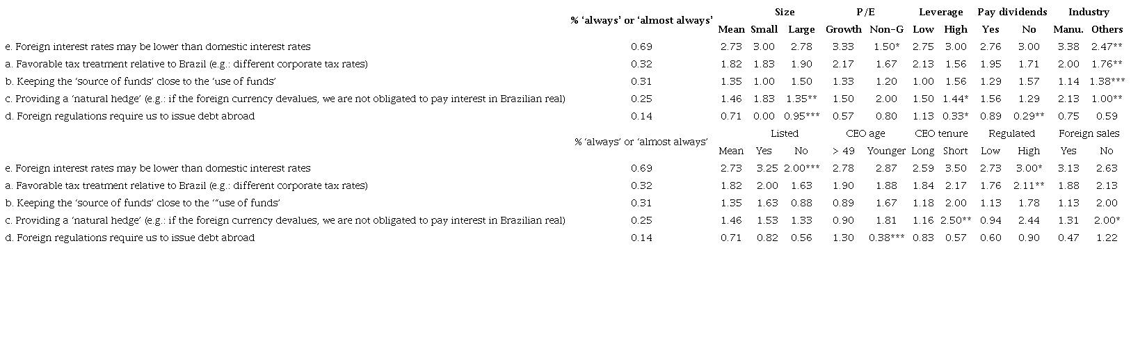 The index of mean square contingency () is reported. This statistic measures the correlation of ordered groups of attributes. Cross-tabulations are conducted by size (‘large’ firms have sales of at least R$ 300 million), growth (‘growth’ firms have P/E ratios greater than ten), leverage (‘high’ have a debt-asset ratio greater than 0.25), whether the firm pays dividends (‘yes’), industry (‘manufacturing’ versus all others), public or private firms (‘listed’), CEO age (older than 49 versus younger than 50), CEO tenure (‘long’ is nine or more years on the job), whether the firm is a regulated utility (‘regulated’), and whether foreign sales are greater than 25%.