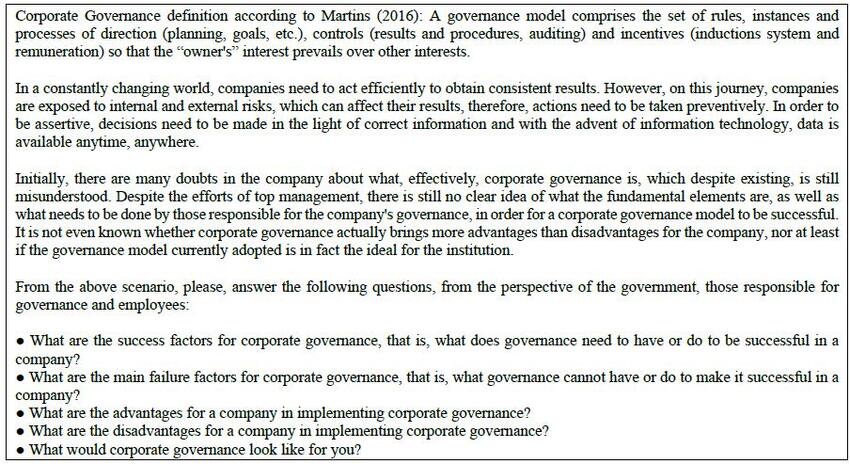 (c) Pilot test and training - Both the scenario and the proposed questions should be overlooked by at least three researchers who have already carried out the CIT (Flanagan, 1973), in order to minimize the risks of errors in the data collection instruments and in the application of the technique. The pilot interview should also be applied to a professional with relevant experience in the studied field, in order to guarantee the validity and reliability of the results. At the same time, the pilot test serves as practical training on how to conduct the interviews and usually generates a series of changes in the critical scenario. Maximum attention should be given to comments received, especially negative ones. It is important to guarantee the confidentiality of the responses and the anonymity of the interviewees so that they do not feel embarrassed. It is expected, at least, that five people will participate in this pilot test. As a way of exemplifying, Figure 10 presents the critical scenario presented to the interviewees in Marchisotti’s (2021) research, which sought to find out the practical gaps on the topic of corporate governance.