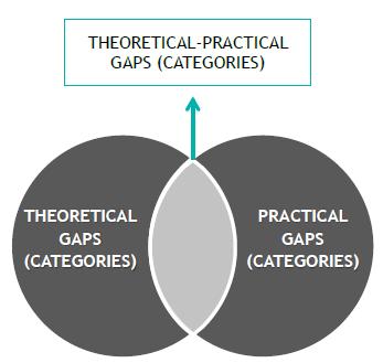 Each of the categories generated - and their respective associated problems - must be compared, in search of items converging in their meaning and scope. Thus, from the comparison between the practical and theoretical gaps - Tables 3 and 4 - it is possible to identify gaps that are present both in theory and in practice - theoretical-practical gaps, according to Table 5.