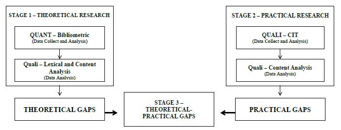 For Stage 1 - theoretical research - it is necessary to detail the procedure adopted in three steps: (a) in bibliometrics to obtain the most relevant papers for the topic researched by the researcher; (b) in lexical and content analysis of the selected papers; and (c) in the identification of potential theoretical gaps. For Stage 2 - practical research - it is also necessary to detail de procedure adopted in three steps: (a) in execution of the critical incident technique - CIT (Flanagan, 1973); (b) in the content analysis - or in the execution of grounded theory, since both can be used; and (c) in the identification of potential practical gaps. Finally, in Stage 3, it is necessary to compare the theoretical with practical gaps, identified in the Stages 1 and 2, in search convergent gaps between academy and the professional practice, including the needs of public sector, civil society, organizations, and social movements.