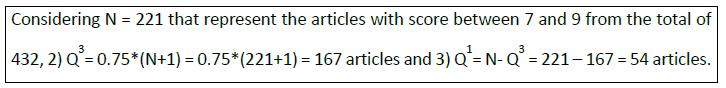 (a) Select the papers that scored seven or nine in the final evaluation of the multicriteria method CPP - Phase 2, with subsequent identification of the first quartile of the sample. To do so, the following procedures must be followed: (1) identify the third quartile of sample N - number of papers in Phase 2, that is, Q3 = 0.75 * (N + 1), and (2) identify the first quartile of sample N, that is, Q1 = N-Q3, according to Figure 6. Q1 = N-Q3, according to Figure 6.