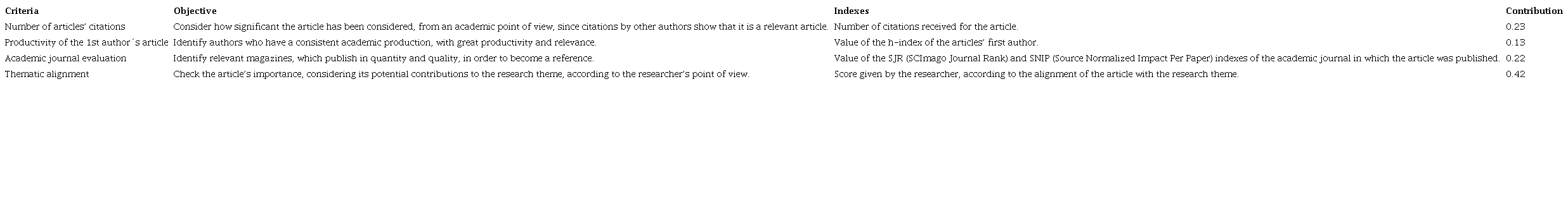 Export a report of the paper from EndNote Web (Hupe, 2019) to Microsoft Excel (David, 2017), creating a new formatting style called ‘Excel Style,’ so that the following information can be exported: authors, year, title, academic journal, summary, and keywords. Then, the multicriteria CPP method (probabilistic composition of preference method) is applied, according to Table 1 (Treinta, Farias, Sant’Anna, & Rabelo, 2014), giving scores for each of the four proposed criteria. It is necessary to use scales, that is, after multiplying the indicator column by weight, the result is converted to an odd scale from one to nine - one, three, five, seven, nine.