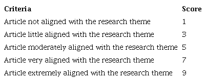 To identify the h-index of the first author and the number of citations of the paper, the researcher should look for the author’s name in Google Scholar (Silva & Grácio, 2017), by clicking on the author’s name, in one of the papers written by him and identified by the search engine. Be careful with homonymous authors. To identify the SJR and SNIP indexes, simply access the Scopus website (Scopus, 2018), informing the name of the academic journal or its ISSN, within the sources tab. Regarding the last criterion - thematic alignment, as this is an analysis that varies from researcher to researcher, it is suggested to use the Table 2 as a reference for the scores, after reading the title and summary of the papers.