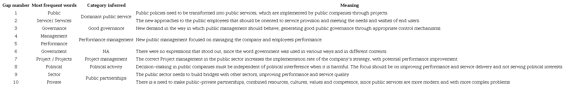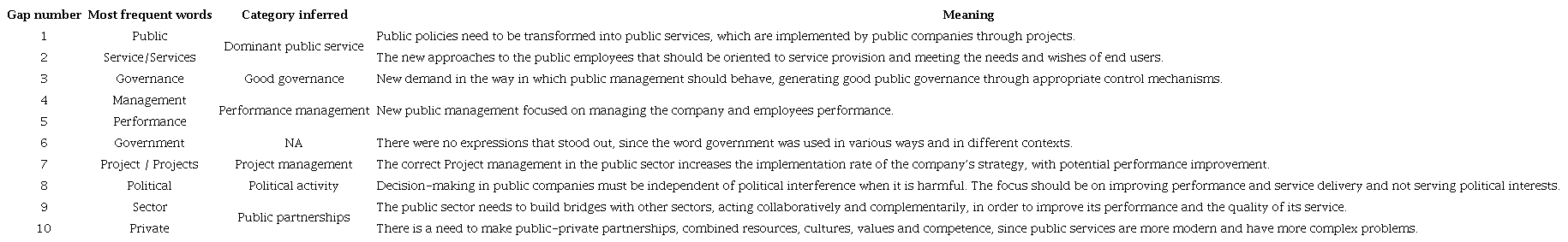 It is worth mentioning that in the identification of practical gaps there is a chance of using grounded theory over content analysis, following the theoretical framework of Corbin and Strauss (2008). In this case, it is necessary, during coding and categorizing the content, to use the same words and form as mentioned by the interviewees, with no space for the researcher to manipulate them (Andrews, Mariano, Santos, Koerber-Timmons, & Silva, 2017).