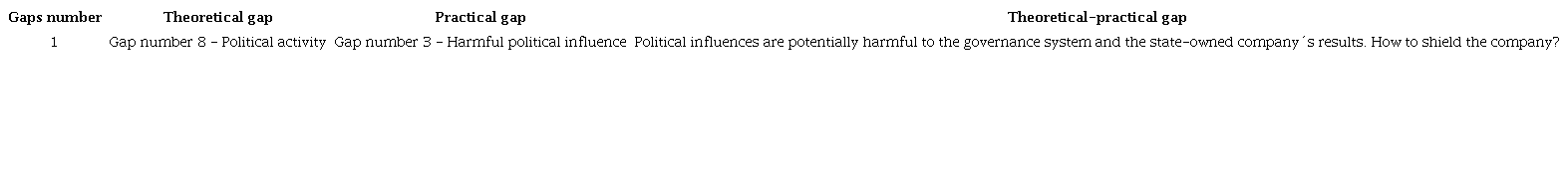 Marchisotti (2021) identified 30 theoretical gaps, 24 practical gaps, and eight theoretical-practical gaps, choosing one practical gap as the problem research - stakeholder’s perception that the governance system does not add value to the company’s results/performance. In this paper, we include an extract of ten theoretical gaps, ten practical gaps, and one theoretical-practical gap to be used as an example at the Stage 1.
