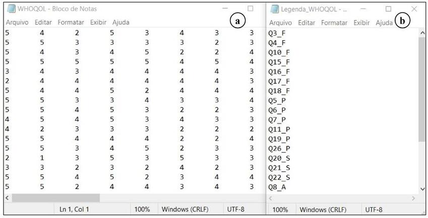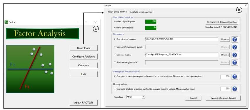 The software takes only .txt and .dat files separated by tabs. The user must generate this file structure (save as) in another software, such as Excel or SPSS, since Factor does not have an interface for data editing. Do not include the variables labels in the first line, and include in the file only the variables that will be used for the analysis, as shown in Figure 2a. This is strongly recommended because the software reads variables in a generic format (v1, v2, …, vn), and a large database may decrease productivity and confuse the user. In addition, the software generates bootstrap samples including all the variables in the database before configuring the analyses - any changes in the analysis configuration, such as removing variables, may cause the software to shut down. Optionally, the user can insert a label file for the variables as shown in Figure 2b. This file must have the same number of lines as the number of columns in the database, and a maximum of 40 characters per line.