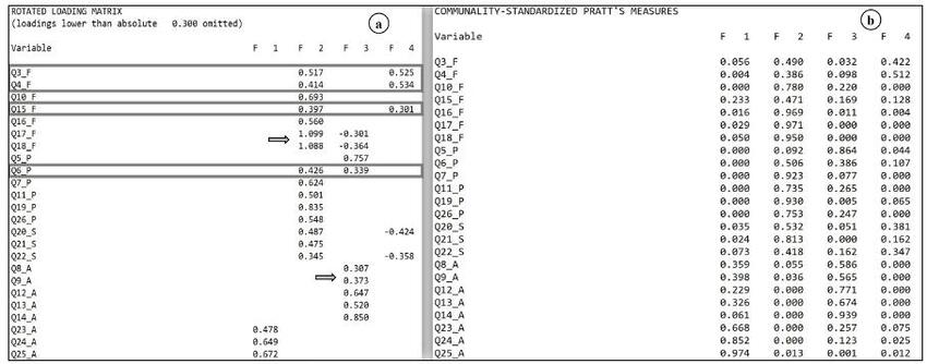 The next block is mostly related to the estimates of the factor loading matrices (unrotated loading matrix, weights of robust rotation, semi-specified target loading matrix, rotated loading matrix, and structure matrix). Since these factor weight estimates are standard outputs in any software running EFA, we chose to show only the rotated factor loadings matrix (>0.30) in Figure 10a in order to carry on with the example. An additional advantage of Factor is that it also shows the factors loadings and the correlation between factors in their confidence intervals via bootstrap (omitted blocks).