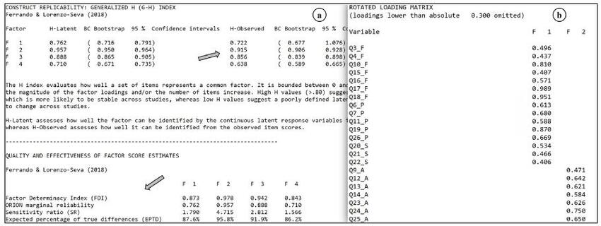 In line with the PA results, the block showing a few replicability and quality measures of the factor scores (Figure 11a) indicates a good fit for only two factors (F2 and F3). The first measure, H-observed, is noteworthy. It indicates how much a set of items represents the common factor. Its value ranges from zero to one; values above 0.80 suggest a good definition of the latent variable, which is likely to be more stable for future studies. It is important to highlight that the H-latent index reflects the estimated replicability when the items are interpreted as continuous variables, while the H-observed index reflects the estimated replicability when the items are interpreted as original variables, similar to Likert-type measures (Damásio & Dutra, 2018; Ferrando & Lorenzo-Seva, 2018).