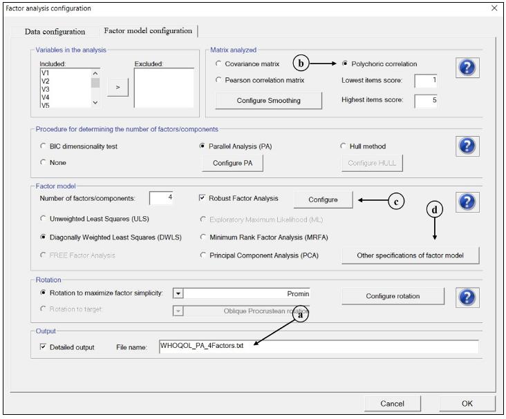 In Factor model (Figure 3), we defined four factors to estimate due to a priori expectations regarding WHOQOL. The two most recommended methods are ULS and DWLS, since we are dealing with ordinal variables with five ordinal answers. The latter is the same WLSMV used in MPlus. ML will only be available if we do not select a polychoric matrix. The option FREE factor analysis is still being developed by the authors of Factor and is not currently available.
