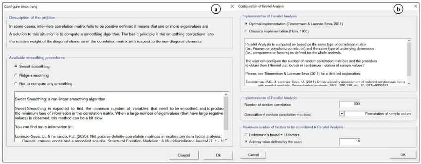 In the menus Configure smoothing and Configure PA (Figure 4), the Factor defaults are usually maintained. The first menu (Figure 4a) refers to the algorithm used to solve the problem of a non-positively defined matrix, which can happen particularly for polychoric matrices when using the least squares methods. In essence, these algorithms consist in smoothing (changing the relative weights) diagonal elements in relation to off-diagonal elements, losing as little variance as possible in the process. The default algorithm in Factor (sweet smoothing) focuses only on the problematic variables, which makes it more efficient at not losing variance (Lorenzo-Seva & Ferrando, 2020).