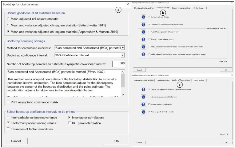 The first one (Figure 6a) refers to the configurations of the confidence interval estimates via bootstrap; in this case, we are adopting the default option in Factor. The robust method to estimate the adjustment measures is the same used in the MPlus software (WLSMV), which is the most complete when it comes to SEM. As previously mentioned, a sample n = 500 was considered sufficient for our purposes, and the adoption of the BCa (bias-correlated and accelerated) method is the most recommended to estimate the intervals via bootstrap. The options Factor/Component loadings values and Inter-factor correlations will compute the bootstrap intervals for the factor loadings and the correlation between factors, respectively. It is important to highlight that Factor is also able to generate models based on the item response theory (IRT) (Damásio & Dutra, 2018).