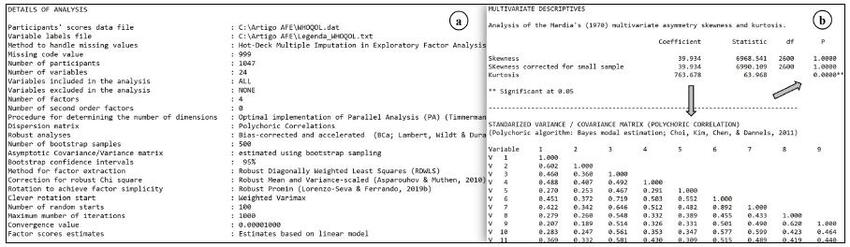 Next, Factor presents some univariate statistics and the bar chart for each of the observed variables entered in the analysis. We will not comment on these blocks. Their interpretation is up to the reader. Next, there are some multivariate statistics (Figure 7b): (a) Mardia’s test for multivariate normality, which was not significant in this case, rejecting the possibility that the data present multivariate normality, and (b) the estimated polychoric correlation matrix. Regarding the first finding, the value of multivariate kurtosis is too high to consider the data to be normally distributed, which was expected, given the ordinal nature of the variables. Regarding the correlations, many values under 0.30 for the same variable may indicate lack of adherence of that item to the proposed factor structure.
