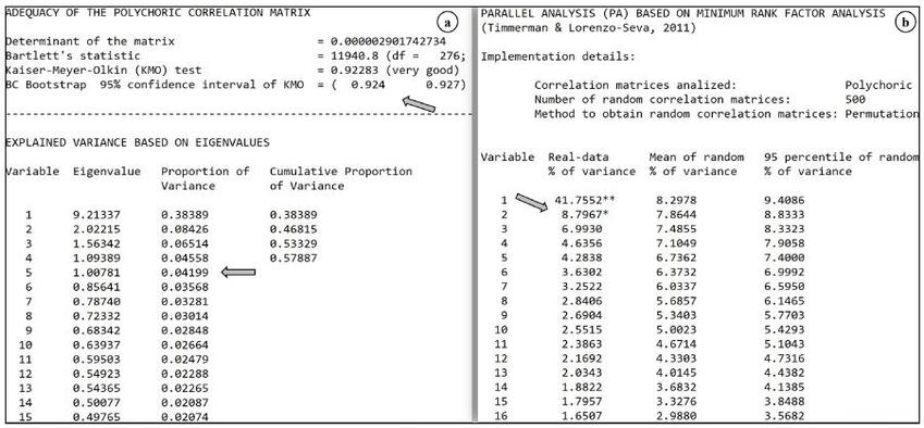 The first block in the output (Figure 7a) details the methodological choices configured in the previous step. We recommend looking at these definitions to check for errors made in the configuration step. In addition, if there are problems when computing the polychoric correlation matrix, Factor will automatically use the Pearson matrix. Note that there is a literature citation for each of the choices, and this continues throughout the output, with the references presented at the end. This feature is very important for researchers who wish to reference their methodological choices in scientific studies.