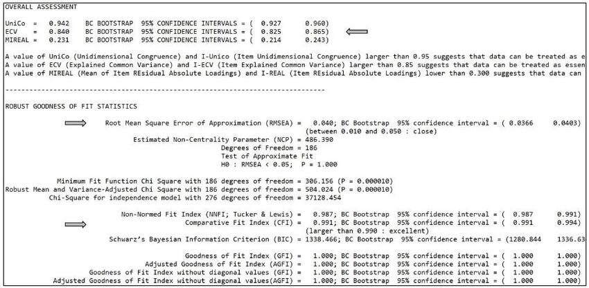 Figure 9 shows several assessment measures that are usually seen only in CFA. However, they can also be obtained in EFA depending on the factor estimation method. When evaluating the measures indicated in Figure 9 in the context of EFA, we are reproducing a PCFA (Hoelzle & Meyer, 2013). The evaluation of EFA using the criteria required in CFA can be quite rigorous at first (Hoelzle & Meyer, 2013). However, a first look at the main assessment measures of a CFA (1 < χ2/df < 3, CFI and TLI > 0.95 and RMSEA < 0.08) may indicate how far a simpler or more restricted model will be achieved. Incorporating PCFA when conducting EFA will result in a more sophisticated and insightful understanding of the EFA results (Kline, 2016).