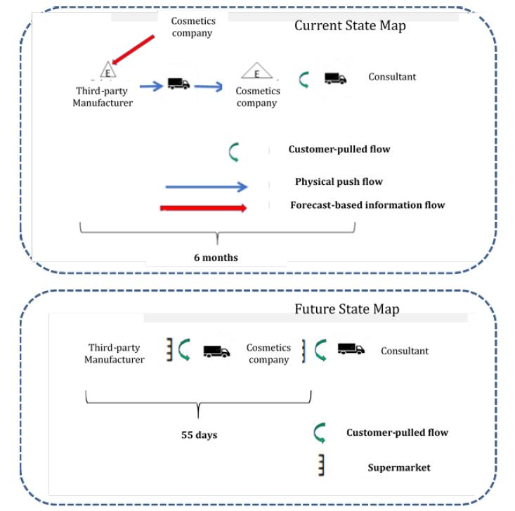 At this stage of the intervention, the team designated by senior management held a series of meetings intended to survey the existing situation and forecast the intervention’s future status. By definition, a current status map follows a product’s path from order placement to delivery to determine the existing conditions. A future status map branches out from opportunities for improvement found by means of the current status map to reach a higher performance level at some point in the future (Womack, Jones, & Roos, 2007). Figure 10 shows a simplified version of such a map, going from a six-month to a 55-calendar day lead time in the case of skincare products.