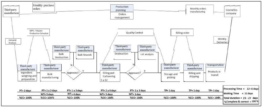 These lead times cover the entire cycle, including inputs acquisition, receipt and release times, as well as the time needed for programming, analysis, and release of the future product, until the effective delivery to the cosmetics company. Times were meticulously studied during the intervention by means of specific meetings with the workers involved in the intervention at both the third-party manufacturer and the cosmetics company. These workers prepared detailed maps and flow reviews to determine times.