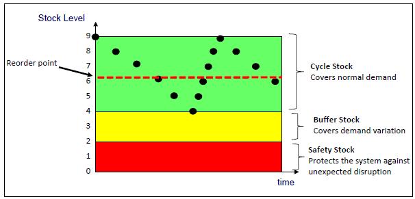 As actual demand - through orders from consultants - consumes the cosmetics company’s cycle stock, it decreases until reaching a level referred to as ‘trigger point.’ It was agreed with the suppliers that, upon reaching this point, a replenishment order would be fired off to the suppliers of the SKUs at hand. Similarly, the third-party manufacturer and the cosmetics company also agreed on the levels of the buffer stock and the safety stock.