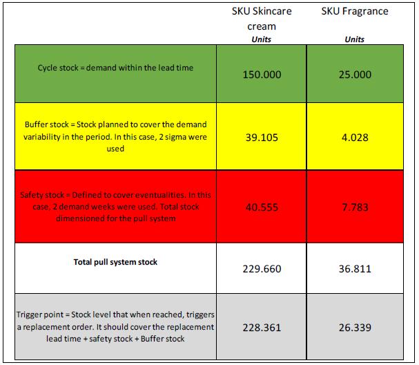 Based on these parameters, the team dimensioned each of the inventories making up the pull system for the items at hand. To illustrate the supermarket logic, Figure 13 summarizes the quantities agreed between the third-party manufacturer and the cosmetics company for the project’s two SKUs.