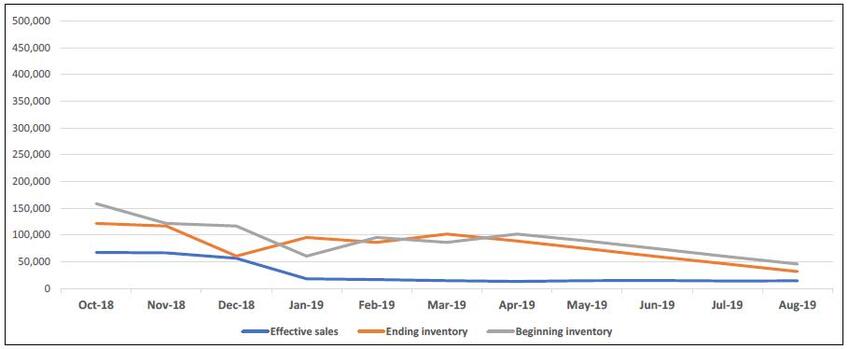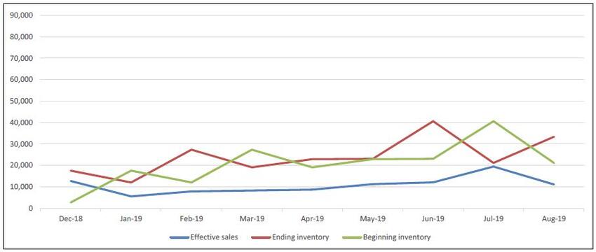 Similar analyses were performed for the fragrance SKU. Figure 7, next, shows the mismatch between start-of-month and end-of-month inventories and monthly sales.