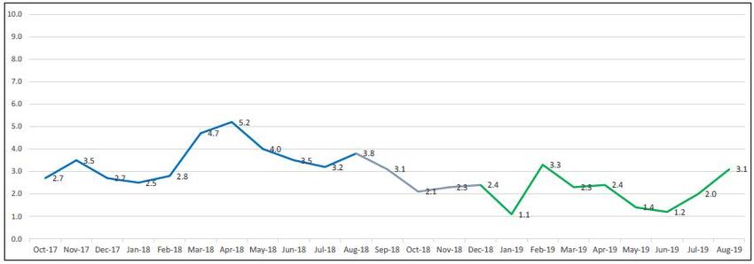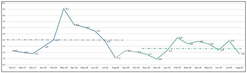 For the fragrance SKU, the mean error between forecast demand at ordering time and real effective sales was around 33% in the period from December 2018 to August 2019. Accumulated average percentage accuracy was approximately 67% in the same period.