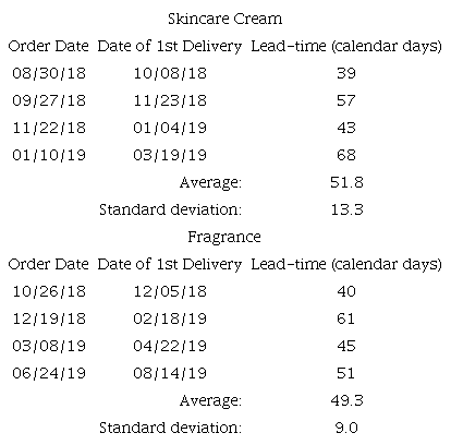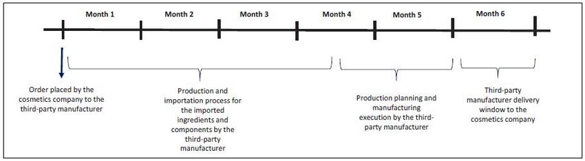 These overseas suppliers take approximately four months to deliver the inputs to a third-party manufacturer, which, by its turn, needs another two months to manufacture and deliver the products to the cosmetics company. These phases, taken together, determine a total lead time of six months for the chain, from placement of an order by the cosmetics company with its third-party manufacturer to the delivery of the order.