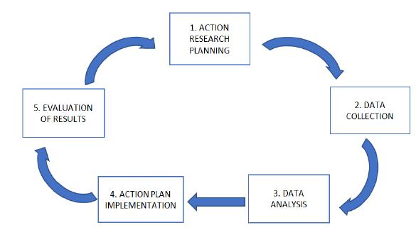 According to Mello, Turrioni, Xavier, and Campos (2012), action research comprises five phases: action research planning, data collection, data analysis, implementation of the action, and review of results. The five phases take place successively and cyclically, so that the outcome of an original cycle is reviewed and taken into consideration for the purposes of preparing the following cycle. Figure 3 shows the cyclical nature of action research phases.