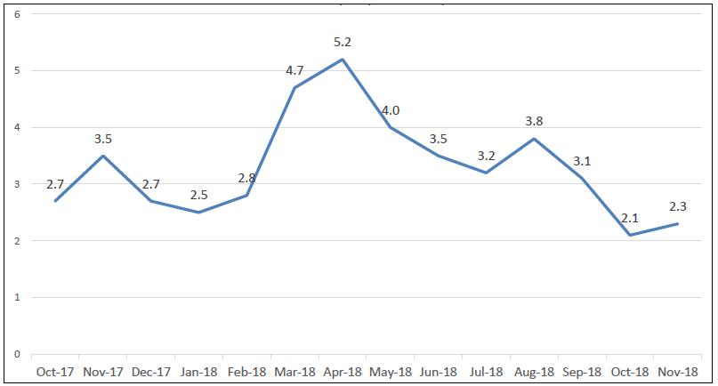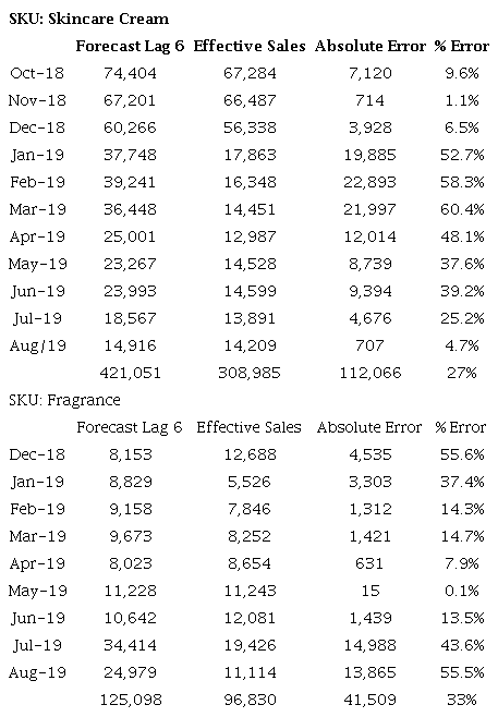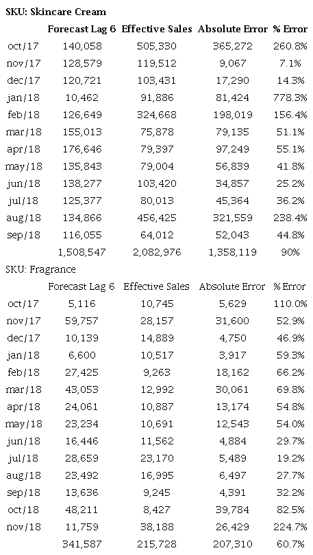 For the fragrance SKU, the mean accumulated demand forecasting error in the 14-month period from October 2017 to November 2018 was 60.7%, with accuracy consequently at 39.3%.
