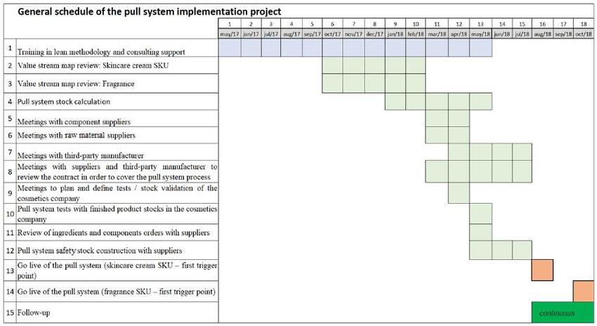 As a key point of the intervention, it was agreed that the cosmetics company’s new orders from the third-party manufacturer would be placed ‘in accordance with consultants’ sales’, characterizing a pull system. To enable delivery within periods appropriate for the sales force, the chosen work mode embraced the lean manufacturing supermarket logic.