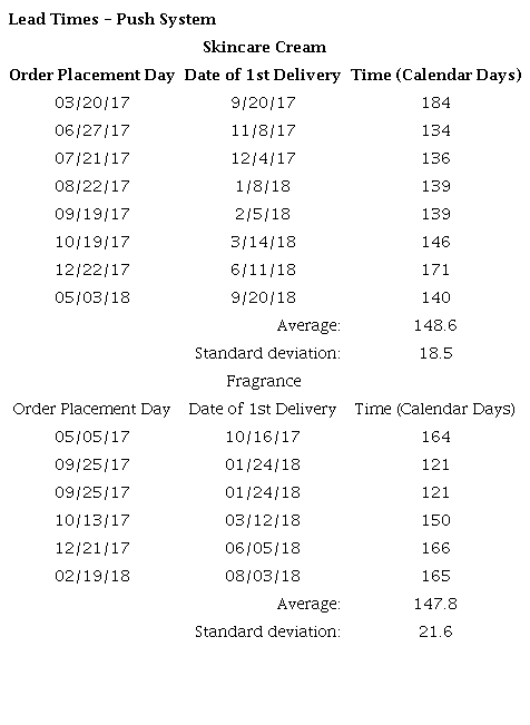 Table 3, next, shows data on lead times for the orders placed under the push system for the two SKUs at hand.