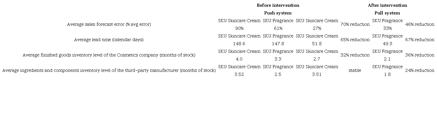 Notwithstanding the significant decrease in sales forecast errors, lead times, and SKU inventory levels, as Table 6 shows, the intervention can be said to have drastically changed production planning and programming as the cosmetics company abandoned the conventional ERP production planning system based on sales forecasts and embraced planning in line with actual inventory levels. The change in logic from push to pull and the developments thereof were clearly the main change that this technological report aimed to show.