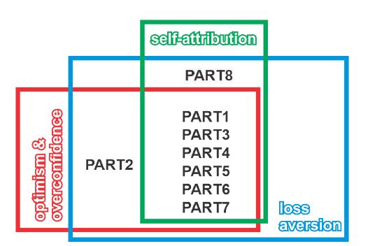 The other biases present in the study were not manifest in all participants. Figure 2 exposes the participants who presented the following biases: sunk cost bias, endowment, external agent effect, regret, and conservatism. Those biases appear to be responses to negative outcomes from past decisions, whether maintaining those investments, fearing to make new investments and regretting not making them in the future, or not changing positions in the presence of new information.