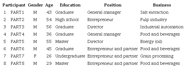 The first contact with the participants was made through phone call, when the research objectives and procedures were explained, as well as the confidentiality of information related to the disclosure of the respondent and companies’ names. The names of participants and companies were suppressed, and a consent term was signed in which the researcher pledged not to disclose the interviewees’ names.