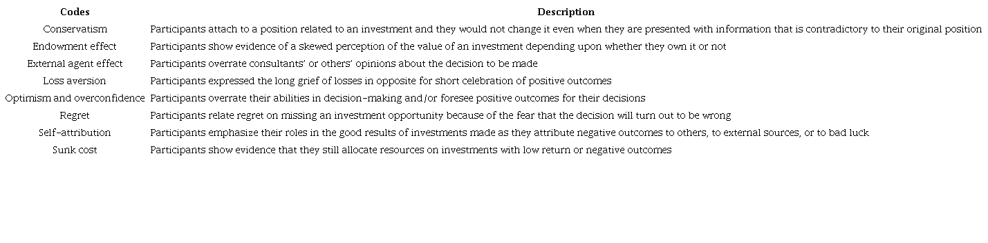 The interviews were fully transcribed, and the text files were imported into the software NVivo® v. 11. The software was used for organizing, managing, and coding data, as well as for generating maps for grouping the results for interpretation. The next step was identifying meaningful text segments, the units of data (Merriam & Tisdell, 2015), that were related to behavioral biases present in investment decision-making. The units of analysis were coded as shown in Table 2.