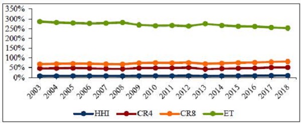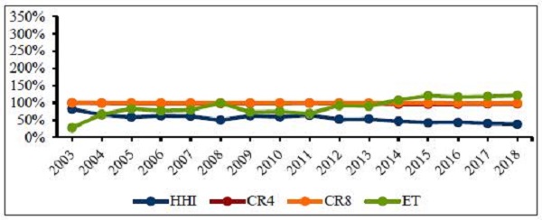 Sob a perspectiva concorrencial, o mercado de seguros, de modo geral, apresentou, para todos os índices médios de concentração (HHI, CR4, CR8 e ET), evolução estacionária em média tal como exposto pela Figura 1. Entretanto, nota-se que houve um ligeiro aumento do índice HHI e queda do índice ET nos três primeiros anos de análise, o que significa afirmar que entre 2003 e 2006 a concentração aumentou. Em parte, isso é explicado pelo fato de que, durante os primeiros nove anos de análise, houve uma queda progressiva no total de players do mercado. Durante os últimos sete anos, todos os índices de concentração, para o mercado segurador como um todo, mostraram-se mais estáveis.