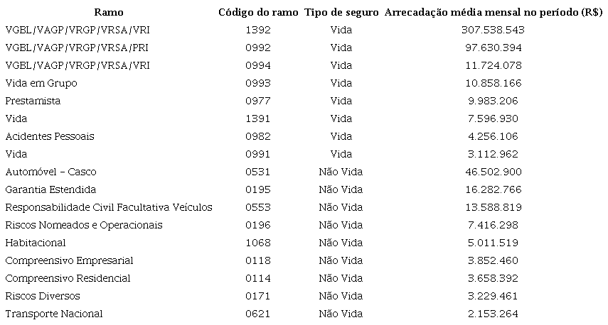 Analogamente à análise apresentada na Tabela 2, o mesmo levantamento foi realizado para os maiores ramos de cada categoria de seguro, vida e não vida, sob o critério de maiores montantes médios de prêmios arrecadados no período, respectivamente, VGBL/VAGP/VRGP/VRSA/VRI (ramo 1392) e Automóvel - Casco (ramo 0531) conforme as Tabelas 3 e 4.