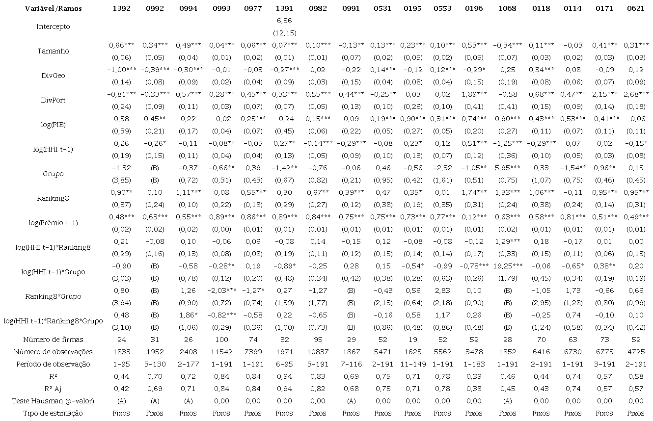 Os resultados da Tabela 5 sugerem que a componente autorregressiva é persistente em ambos os modelos e para quase todos os ramos: firmas maiores tendem a arrecadar mais, ceteris paribus, exceto para os ramos 0991, 1068 e 0114. Por outro lado, as medidas de diversificação geográfica e de portfólio de atuação são menos unânimes. Afinal, trata-se de uma decisão individual e interna de cada companhia, não havendo estratégia de atuação certa ou errada, tampouco única, para auferir vantagens para si (i.e., exercício de poder de mercado).