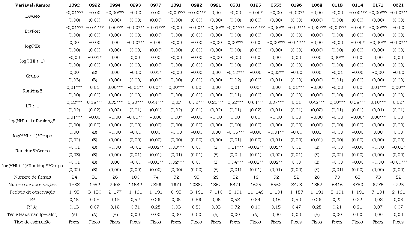 Poucos segmentos apresentaram efeitos de HHI significantes para explicar a proporção de lucros sobre ativos (LR). Esse resultado revela que maiores níveis de concentração tendem a manter estáveis as margens de lucro das entidades seguradoras, ceteris paribus. No entanto, quando interagidos com as variáveis Ranking8i,r,t e Grupoi,r,t, alguns ramos (0977, 0195 e 0621) apresentaram significância: a margem de lucro das seguradoras é reduzida caso esteja entre as oito maiores seguradoras do ramo e caso pertença a um grupo econômico. O exato oposto ocorre nos ramos 1391, 0531 e 0553.