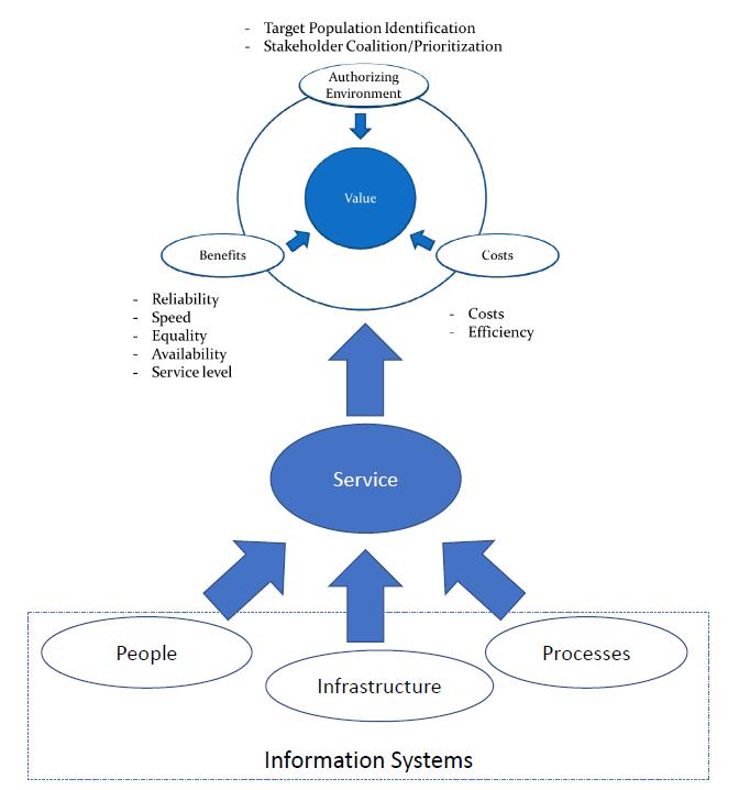 A ideia de demandas de mercado tradicionalmente usada no campo de operações foi elaborada para refletir melhor a realidade de serviços públicos. Uniu-se a noção de valor usada na literatura de marketing (Ravald & Grönroos, 1996), na qual valor é o resultado dos benefícios gerados com serviço em um determinado contexto descontados os sacrifícios envolvidos em recebê-lo, com características do setor público discutidas em Moore (2002). Essa última referência traz a importância de balancear as demandas de diferentes stakeholders envolvidos na gestão, financiamento e uso do serviço Público para definir o que precisa ser feito prioritariamente.