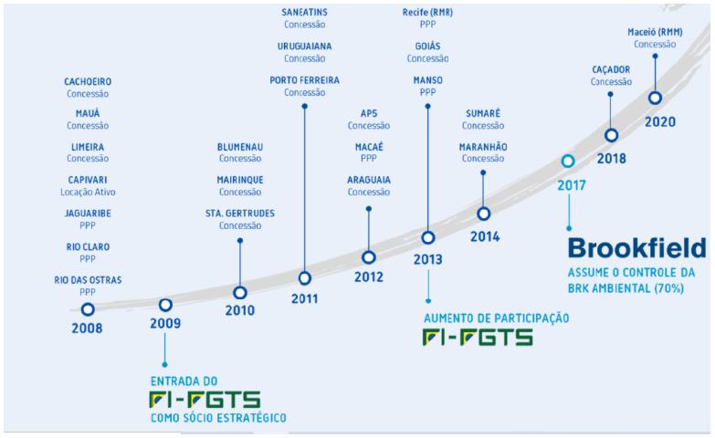 A empresa nasceu em abril de 2017, quando a Brookfield Asset Management, empresa canadense presente em mais de 30 países, comprou 70% das ações da companhia. Antes da gestão da Brookfield, a empresa era conhecida por Odebrecht Ambiental, um spin-off do segmento ambiental da Organização Odebrecht criado em 2008. De 2008 a 2016, a Odebrecht Ambiental ganhou diferentes concessões, tais como Limeira (SP), Rio Claro (SP), Mairinque (SP) e Recife (PE). O Anexo 1 mostra a obtenção dos contratos ao longo do tempo e a mudança do controle acionário. Com essa mudança, a companhia presenciou também mudanças na gestão. Ao assumir o controle da BRK Ambiental, a Brookfield trouxe para o Brasil a sua filosofia de gestão. Além da orientação para resultados, do respeito às pessoas, do compromisso com o cliente e segurança, a empresa defende o uso da excelência operacional para aumentar o valor dos ativos da companhia e produzir retornos sólidos para os acionistas.