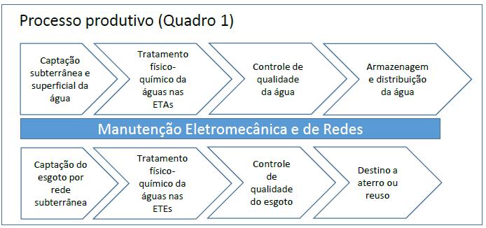 A área responsável pela manutenção eletromecânica cuida da gestão dos ativos 24 horas por dia (o Anexo 2 mostra a infraestrutura instalada). Esses ativos (por exemplo: compressores, bombas, boosters, EEAs, EEEs, cabines e disjuntores) são monitorados ao longo dos processos de tratamento de água e esgoto. Para garantir o seu pleno funcionamento, é necessário executar manutenções preventivas e preditivas. As equipes de manutenção precisam estar disponíveis 24 horas por dia, para atender às ocorrências emergenciais.