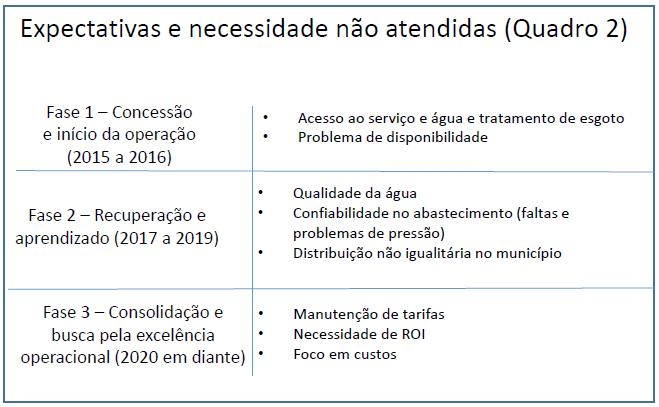 No começo da concessão de Sumaré, fica claro que a população tem um grande problema de abastecimento de água e coleta de esgoto. Isso se traduz claramente como um problema de disponibilidade do serviço prestado. Na segunda fase, ainda há um problema de disponibilidade, porém menos crítico, pois já se investiu em infraestrutura na primeira fase. O que começa a aparecer fortemente são problemas ligados à qualidade da água, confiabilidade no abastecimento (uma hora tem, outra hora não, ou tem, mas com pouca pressão) e equidade no atendimento dos diferentes bairros. Na terceira fase, a operação já é capaz de entregar um serviço de qualidade para a população de maneira homogênea. No entanto, a operação precisa se pagar, mas há pressão para as tarifas se manterem constantes, por causa do descontentamento passado da população e pelo fato de ser um ano eleitoral. O foco em custos emerge, então, como algo crítico.