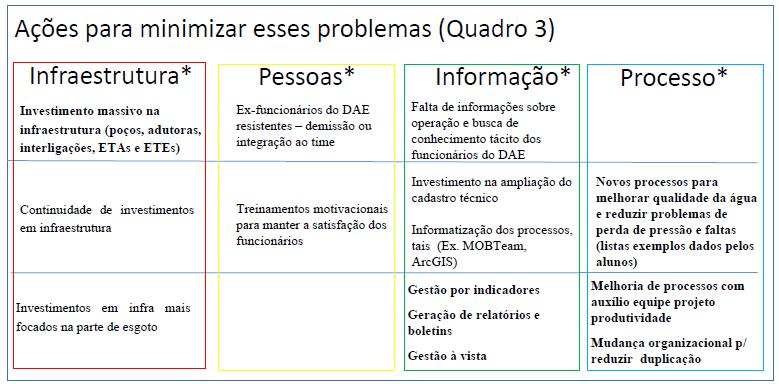 Aqui os alunos podem dar diferentes sugestões para resolver os problemas listados na questão 5. Alguns alunos podem dar respostas muito embasadas no que foi feito na unidade de Sumaré. Mas é necessário direcionar a discussão para medidas que possam ajudar na questão do atendimento, como a abertura de novas agências em diferentes praças, criação de novos canais de atendimento e ampliação de horários de atendimento. Com relação à disponibilidade e confiabilidade no abastecimento, medidas adotadas na fase dois de Sumaré podem ajudar. Mas na categoria de gestão de pessoas, é necessário adicionar processos e medidas para gerenciar o comportamento da população (usuários) e estimular a redução do desperdício. Algumas ideias aqui podem envolver ações para informar usuários e obter redução de desperdício, ou incentivos por meio de descontos por nível de economia de água.