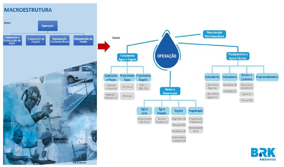 Foi proposta também uma reestruturação organizacional, que trouxe otimização de equipe e gestão (Anexo 5). Ela centralizou a captação e o tratamento de água e esgoto em uma área, concentrando nela a responsabilidade pela gestão da infraestrutura. Criou-se a área de redes e reservação, que unificou as atividades de programação de manutenção antes realizadas por áreas diferentes. Os serviços de manutenção de redes de água foram separados em reparos leves (por exemplo: manobras de registros, reparos em cavaletes e vistorias) e pesados (por exemplo: reparos em adutoras e ligações), permitindo uma divisão por especialização das equipes.