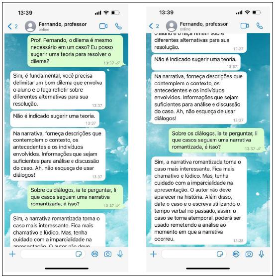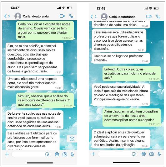 João questionava-se sobre como definir questões que gerem discussão. Será que deveria abordar as duas possibilidades de aplicação - presencial e on-line? Quantas alternativas seriam suficientes para a análise do caso? Quais seriam as melhores estratégias para incluir em plano de aula virtual? Em que momento se deve testar o caso com a turma? Estava imerso em dúvidas e resolveu conversar por WhatsApp com Carla (Figura 2).