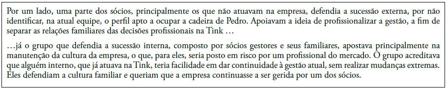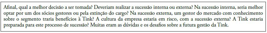 Era um momento crucial. João precisava de ajuda e decidiu enviar para o professor Fernando as informações que tinha organizado, além de listar os obstáculos que visualizava nas informações que a empresa lhe tinha passado, sobre o processo de sucessão. Ele acreditava que um daqueles obstáculos poderia ser o dilema do caso. O professor Fernando refletiu junto com João e tentou identificar o problema principal, que fosse o mais abrangente e, simultaneamente, permitisse gerar mais discussões sobre as soluções possíveis. Ao final, ambos concordaram que a principal decisão a ser tomada pela empresa se referia a realizar uma sucessão interna ou uma sucessão externa. Mas também cabia verificar decisões relacionadas, como: em uma sucessão interna, seria melhor optar por um dos sócios gestores ou pela extinção do cargo? Na sucessão externa, como escolher um gestor do mercado com conhecimento sobre o segmento e alinhado à cultura da empresa?